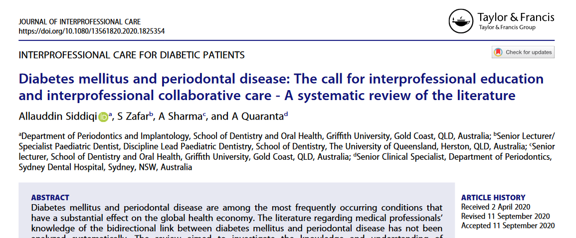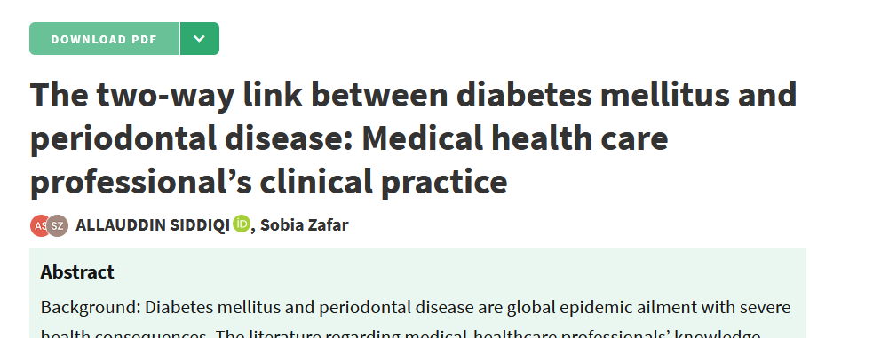 My research has focused primarily on the field of periodontal infections and their connection with diabetes mellitus. My recent study has concluded that diabetes mellitus lacks knowledge of the bidirectional association between periodontal disease and diabetes mellitus. In this regard, medical-healthcare professionals and dentists should provide mutual care and should consider every patient as a shared responsibility. Furthermore, oral health should be integrated with routine diabetes care to optimize patients’ quality of care living with DM.